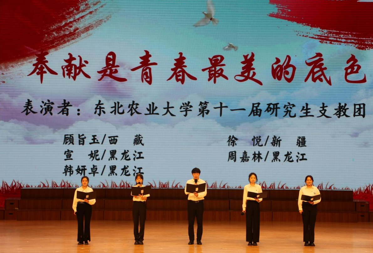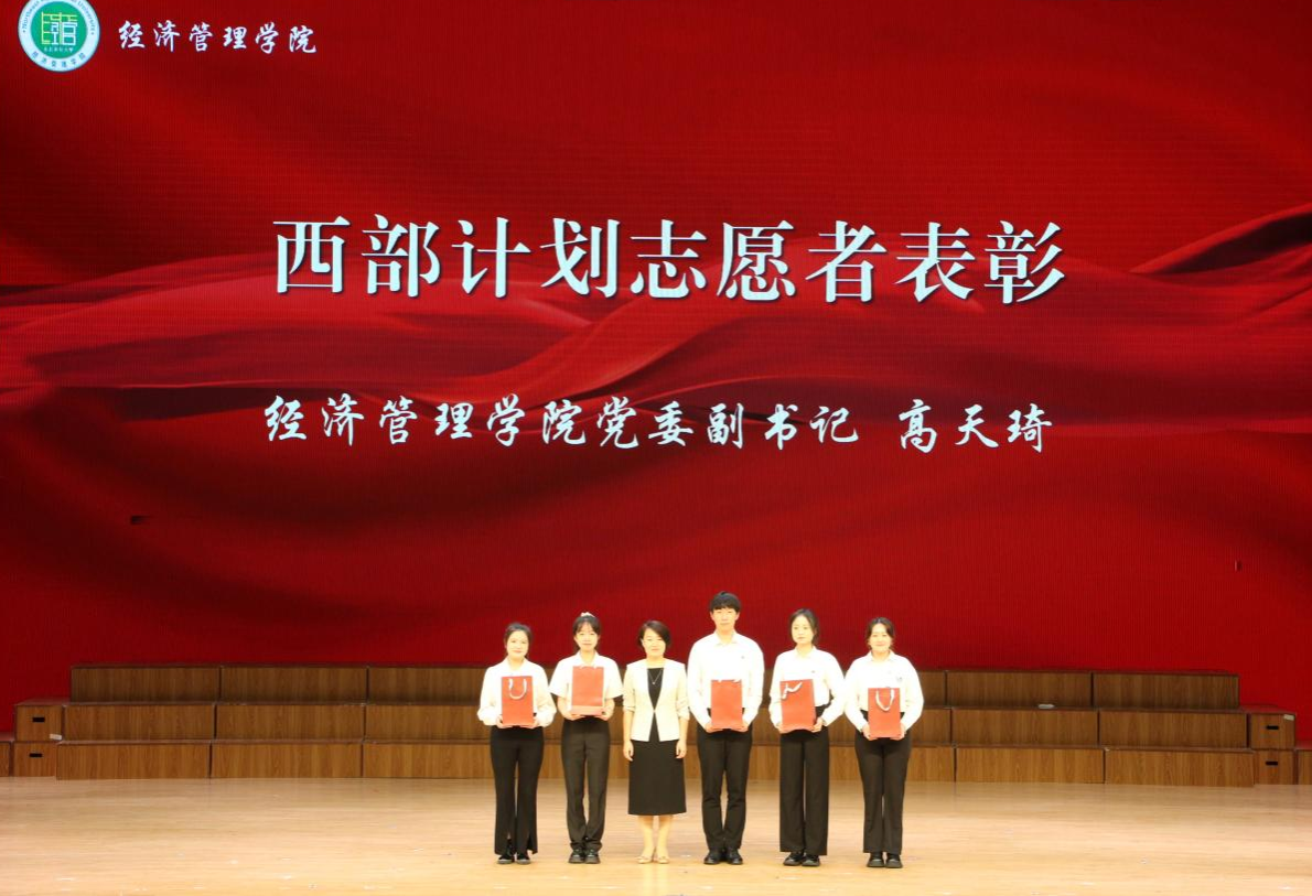 诗朗诵《奉献是青春最美的底色》展现研究生支教团志愿者们的爱国情怀。研究生支教团在未来的一年中将秉持“博学笃行,明德亲民”的校训,在实践中成长,为教育事业贡献青春力量,厚植家国情怀,勇担时代责任。高天琦代表全院师生为经管研究生支教团送上暖心礼品。