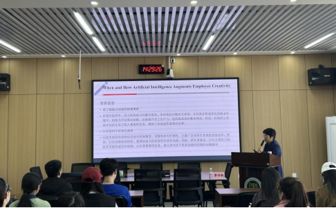 李仲秋老师带领研究生共同精读《When and How Artificial Intelligence Augments Employee Creativity》,深入探讨研究框架、理论贡献和方法设计。该论文通过混合研究法揭示了人工智能(AI)与员工协作(通过顺序分工形式)对员工创造力及绩效的影响,探讨了理论机制、作用条件及相关后果,分析这种协作模式在组织中的应用价值与潜在问题。李老师特别强调,研究方法的透明性与问题导向的创新,是本文入选顶级期刊《Academy of Management Journal》的关键。研讨尾声,参会研究生积极提问,就文献中的一些难点和疑点与李老师展开讨论。