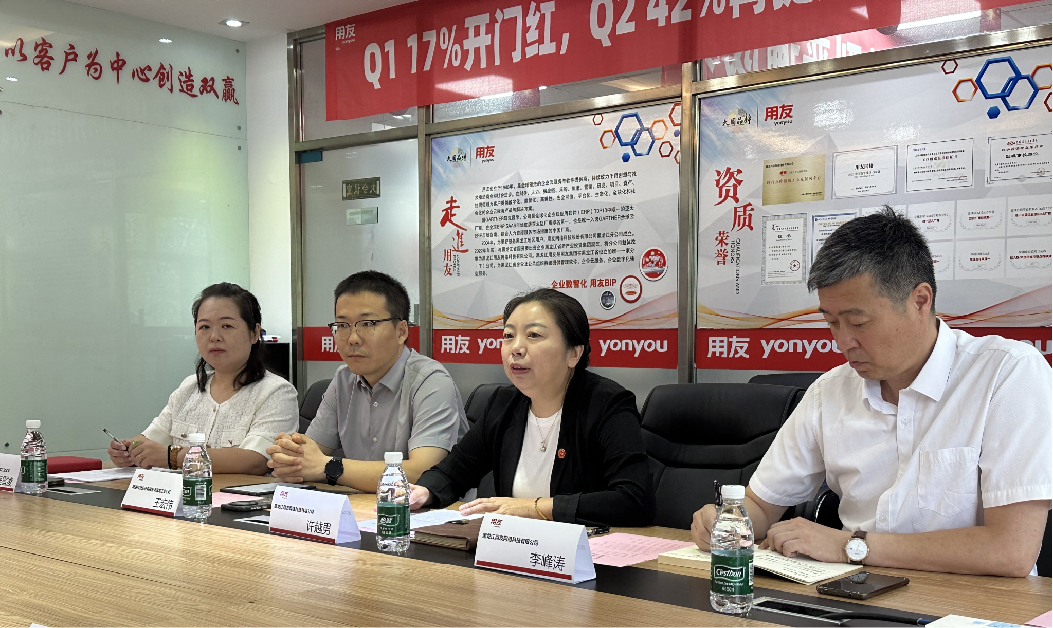 会议伊始,黑龙江用友网络科技有限公司总经理许越男介绍了公司在推动区域企业数智化转型方面的工作成果。随后,新道科技黑龙江分公司总经理王宏伟就区域校企合作开展情况作了详细说明。U8国际经理余志刚教授从公司整体发展、团队建设、人才培养等方面介绍了公司在相关领域的进展。黑龙江用友副总经理李峰涛进一步阐述了公司的生态合作计划,并展望了未来三方合作的广阔前景。