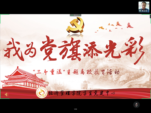 在重温入党谈话环节,毕业班辅导员张贺和毕业生党员代表纪萌、姜诺重现了党组织与党员谈心谈话环节。纪萌、姜诺对党组织大学四年来的关怀与指引表达感谢。张贺表示,期望经管学子能扛起时代的重任,以不变的初心继续书写时代里一则宏伟的篇章。