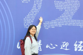 新生在由1102名全体新生名字组成的留念墙合影