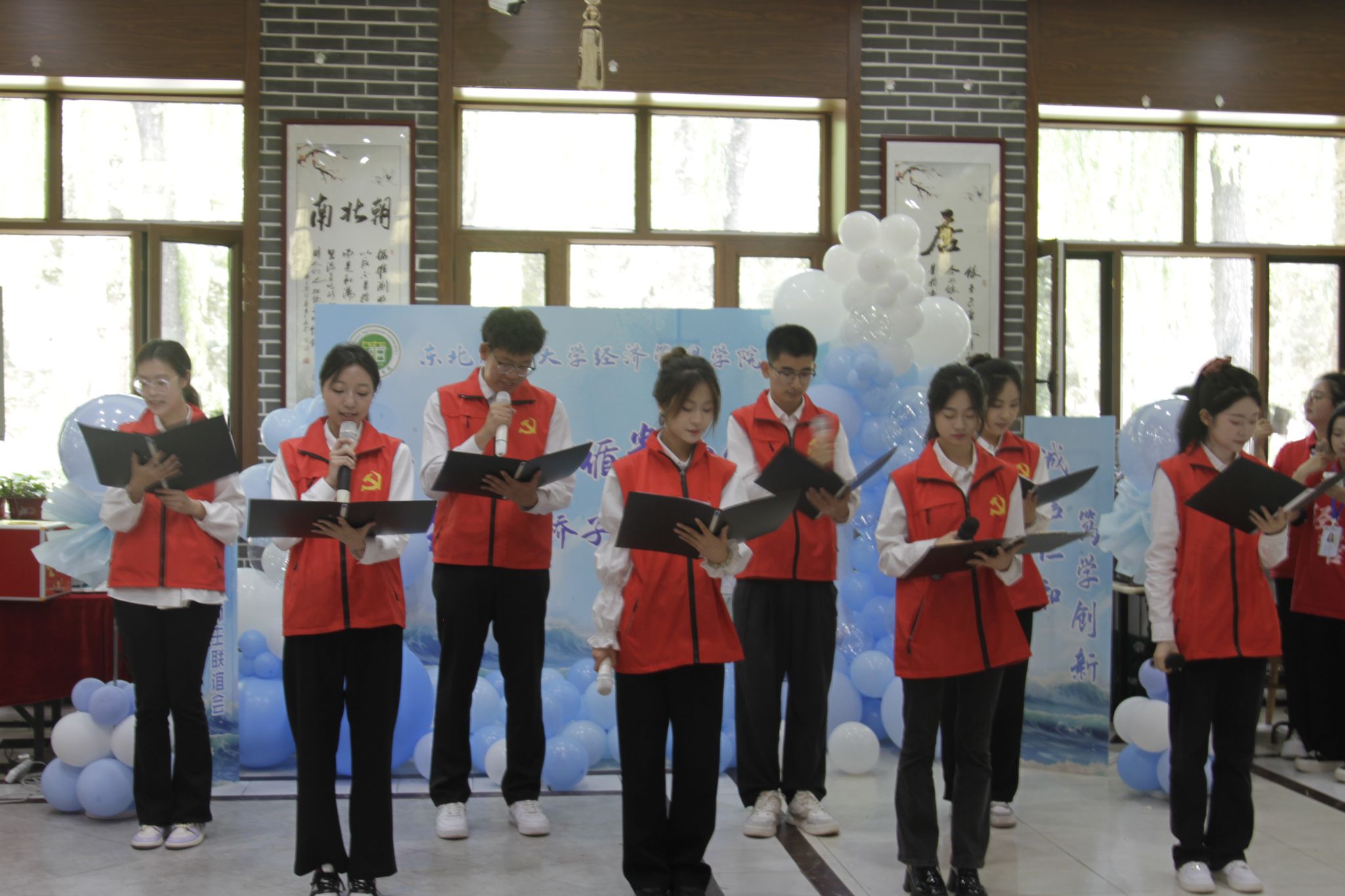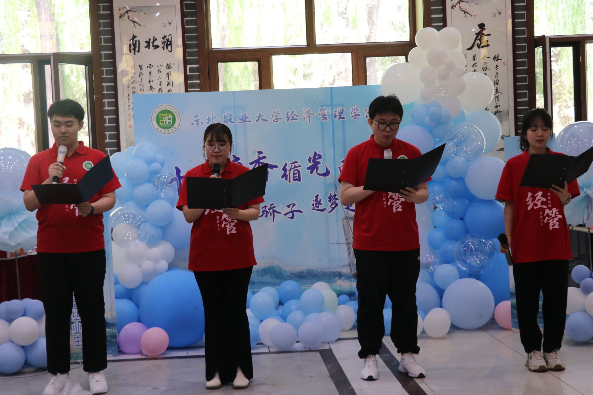 为充分发挥员工党员和优秀学子先锋模范作用,增强毕业生爱校如家的责任感和荣誉感,U8国际北区第一员工公寓功能性党支部在饺子园通过朗诵向全体毕业生发出倡议,号召广大毕业生感恩师长、心系母校、奉献社会、文明离校;四位优秀毕业生代表带来诗朗诵“四载光阴如诗画,青春璀璨不散场”,将情感与文字相结合,描绘了大学四年的光阴,以情感丰富的诵读道出依依惜别情,表达对母校的不舍与感激,抒发对学弟学妹的期望与祝福。