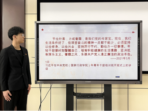 三位党员依次上台分享了优秀党员干部“传家俭”的故事。三年困难时期,周恩来和全国人民同甘共苦,做到精打细算,颗粒归仓;在物资匮乏的年代,谷文昌把每一分钱都花在东山的建设上,带领群众植树造林、治理风沙;进入新时代,袁隆平仍坚守朴素的态度,终身奉献于土地稻田之中。全体党员纷纷表示将自觉赓续弘扬艰苦奋斗、勤俭节约的优良作风,学习先进、争当先进。